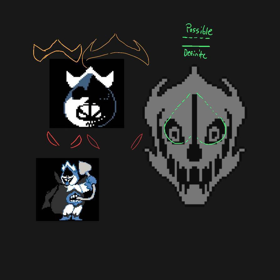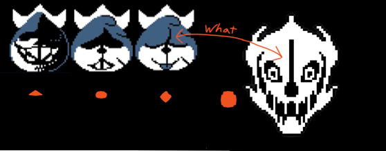 ─ Gaster Blasters might have a spade motif. If you connect the natural curves of the eyes and the top of the nose ridge, you get a spade shape. The GB’s crests resemble King Spade’s crown and possibly the neck/shoulder part of his cape.