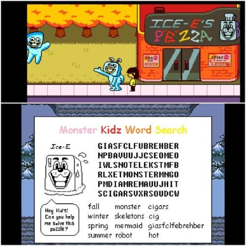 ─ sans’ word search is from ICE-E’s, which is a brand we only see in DELTARUNE. As far as we know, there is no trace of this brand in the UNDERTALE universe. It definitely doesn’t appear to be one from a newspaper — it’s a distraction given to kids at restaurants.