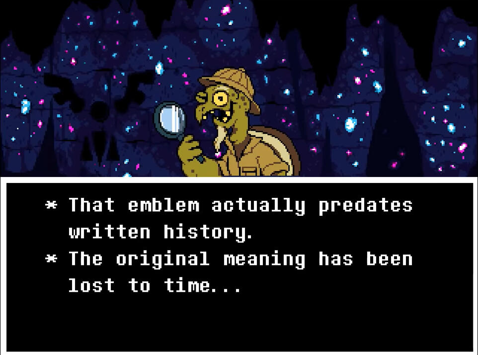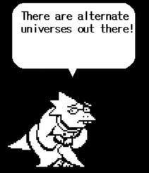 ─ Alphys seems to be in-the-know about sans’ time-space shenanigans. In the epilogue of the pacifist ending, there’s some dialogue that suggests Alphys and sans are quite familiar with each other. Both of them want to keep this a secret for whatever reason. In a neutral ending in which Alphys becomes the ruler, she is mournful of the deaths of Undyne, Alphys, and Asgore, but is glad that “at least sans is here”. In the MTT quiz, if you pick “Don’t Know” to the question about her crush, Alphys reveals that she has done research on alternate universes and knows they exist. Both sans and Alphys have connections to Gaster, who is quite prevalent in DELTARUNE. She, along with sans (and coincidentally, the ICE-E word-search) are affected by Fun values and have their own Fun events. It seems a little random, but what if all the Fun events are Gaster-related? Are Alphys and sans the two people mentioned in Entry 17?