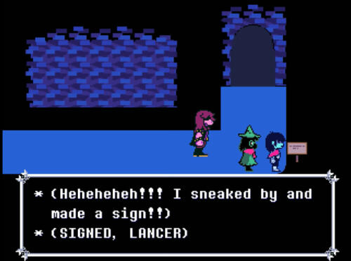 ─ sans can teleport, that is, use “shortcuts”, as evidenced by appearing both in front and behind the character in Snowdin, going to Grillbys, chasing after Papyrus in the wrong direction during the Pacifist ending scene, etc. Though Rouxls Kaard is shown to teleport, Lancer’s style of teleporting most closely resembles sans’. There are multiple instances in which Lancer stays ahead despite the Player passing him (for example, Lancer sneaking a sign past the party despite there only being one way to the door).