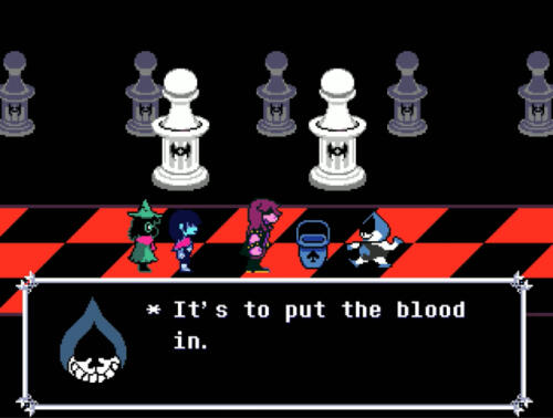 ─ Lancer more or less implies that Darkners bleed, though we haven’t seen any examples of this yet. Ralsei doesn’t correct him, however. We know that the monsters in the light world don’t bleed (“Does it hurt to be made out of blood?”), and Susie’s comment (“Everybody bleeds, right?”) could be read as her trying to look cool for Lancer. Then, does sans bleed?